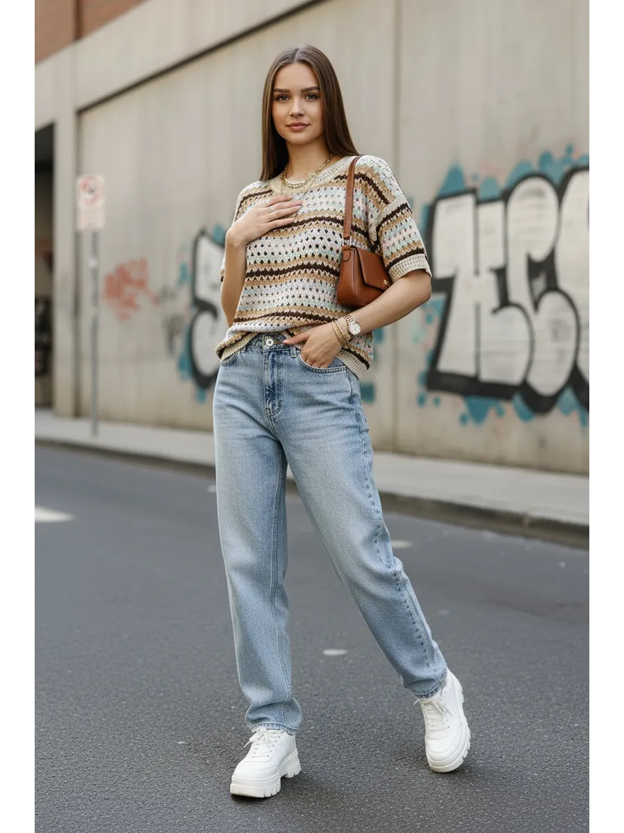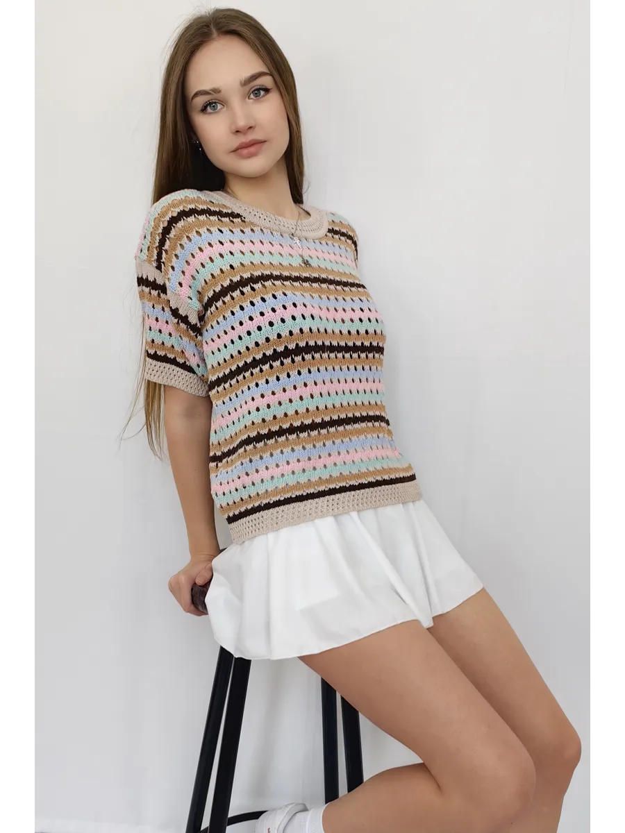 Наша вязаная модель отличается оригинальным принтом, который привлекает внимание. Ажурная текстура и детали в виде дырок создают игривый и современный образ. Свитер, выполненный в технике паутинка крупной вязки, отлично смотрится как в сочетании с юбкой, так и с джинсами. Полосатый узор добавляет изюминку, а оверсайз крой делает эту вещь подходящей для девушек-подростков, что делает её универсальной для любого стиля.