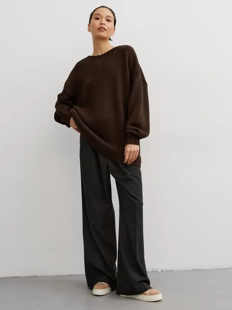 Удлиненный вязаный свитер крупной вязки с округлая горловина создан для зимних радужных вечеров с друзьями и долгих прогулок в осенний сезон. Объемный джемпер с горлом выглядит расслабленно, стильно, создавая комфорт и уют. Широкий крой, большой размер, свободный фасон оверсайз подходит для женщин любого возраста и комплекции, нравится подросткам и беременным. Женский шерстяной пуловер сохраняет мягкость. За счет акрила не мнется, сохраняет цвет и форму после многочисленных стирок. Длинный базовый свитшот украсит повседневный гардероб для женщин и девочек. Модный трикотажный джемпер заменит толстовку на молнии для спортивного образа с рваными джинсами и яркими леггинсами. Свободный оверсайз свитер больших размеров не сковывает, заменит худи подросткам. Уютный, теплый объемный джемпер с круглым горлом комфортный для повседневной носки даже летом, мягкий, при этом трикотажная кофта с длинным рукавом не мнется, держит форму, сохраняет цвет. Удлиненная модель смотрится как вязаное платье для невысоких и, как укороченный пуловер для высоких, подойдет беременным. Добавьте юбку в школьном стиле, платье с леопардовым принтом или короткие кожаные шорты. Заправьте в цветные брюки, накиньте пиджак на пуговицах и ловите восхищенные взгляды. Укутайтесь в мягкий свитер, как в любимый кардиган, или подарите в подарок сестре, маме, подруге. И пусть зима будет уютной и теплой. 1. модель рост 173см, 110-85-104, 2. модель рост - 166см, 89-61-92. На двух моделях одинаковый размер 42-46. Топик на модели Арт 431805597 шорты Арт 398920272